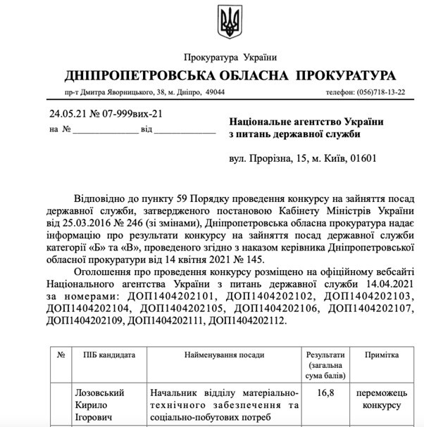 Після “керування” матеріально-технічним відділом кум Біжка Кирило Лозовський пішов не на вулицю, а на підвищення. Так, наказом керівника облпрокуратури Дніпропетровщини від 27 липня 2023 року за № 1687к Сергій Біжко відправив свого кума керувати Синельніківською окружною прокуратурою у ролі прокурора-стажиста, після чого Лозовський у травні 2024 став там заступником. Непогана кар’єра - від “завскладу” до керівника прокуратури найбільшої громади Дніпропетровщини.
