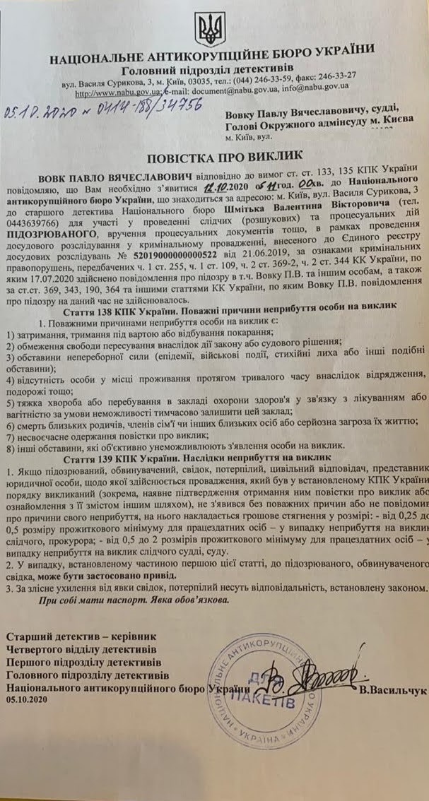 Вам необхідно прибути 09.10.2020 та 12.10.2020 до НАБУ для участі у проведенні слідчих (розшукових) та процесуальних дій як підозрюваного, вручення процесуальних документів тощо, в рамках проведення досудового розслідування у кримінальному провадженні, - повідомляється у повістці.