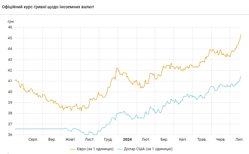 З початку 2024 року офіційний курс долара зріс на 9,2% (з 37,98 грн станом на 31 грудня 2023 року), а офіційний курс євро піднявся на 7,4% (з 42,20 грн станом на 31 грудня 2023 року).