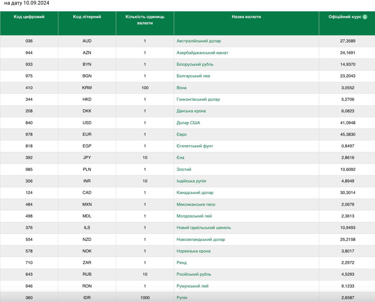 Національний банк України встановив офіційний курс долара на вівторок, 10 вересня, на рівні 41,09 гривні за долар, що на 7 копійок більше порівняно з попереднім курсом, свідчить зниження вартості гривні.