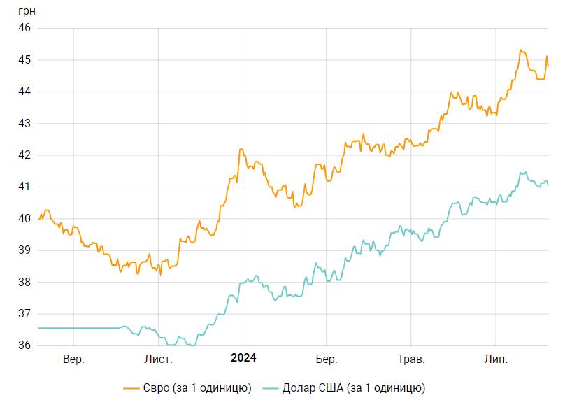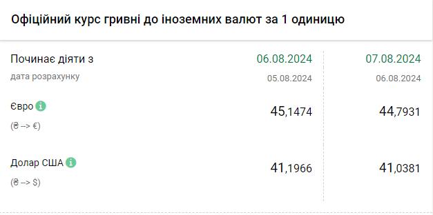 За офіційними даними, опублікованими на сайті регулятора, курс на 7 серпня 2024 року встановлено на рівні 41,0381 гривні за долар, що на 0,1585 гривні менше порівняно з попереднім днем.