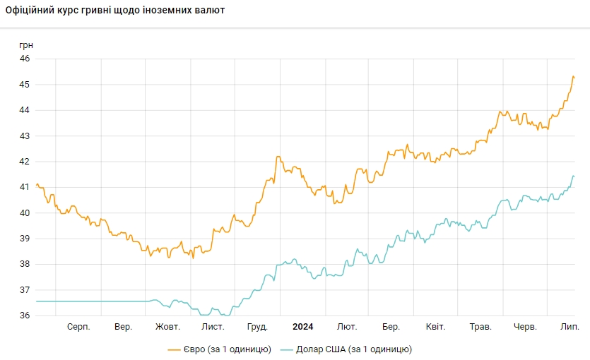 За даними на сайті регулятора, офіційний курс на 19 липня 2024 року становить 41,422 гривні за 1 долар, що на 0,0407 грн менше попереднього показника. Курс євро знизився на 0,0839 грн і тепер складає 45,2618 гривень за 1 євро.