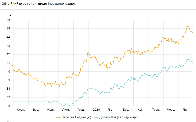 Офіційний курс на 30 липня 2024 року встановлено на такому рівні: 41,0478 грн за 1 долар (-0,0502 грн.).