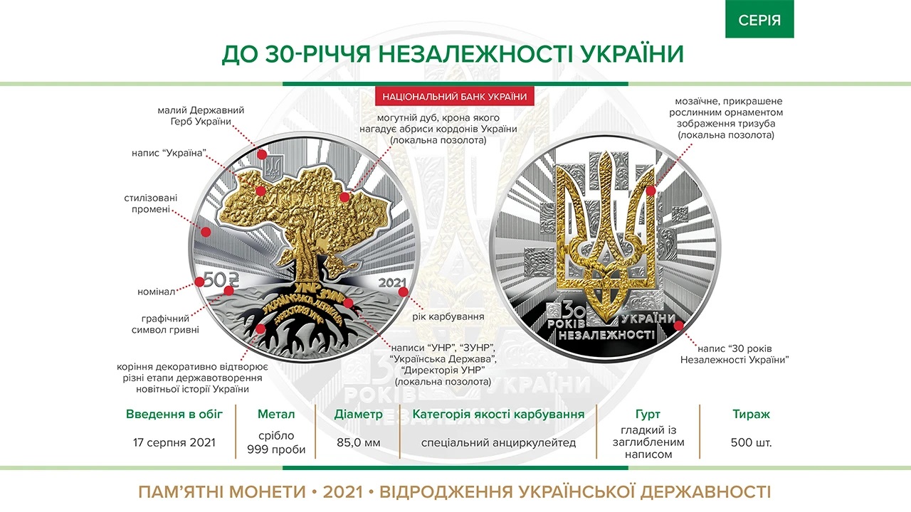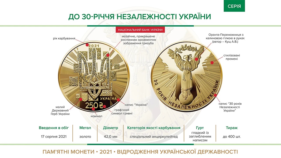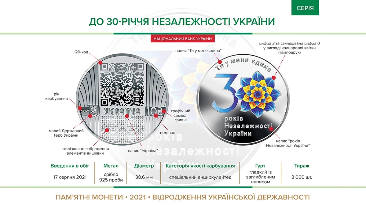 Повідомляється, що додатково Національний банк до цього свята відкарбує нову інвестиційну монету України. Монета "30 років Незалежності України" номіналом 1 гривня зі срібла, що буде введена у обіг 17 серпня 2021 року тиражем 15 000 шт.