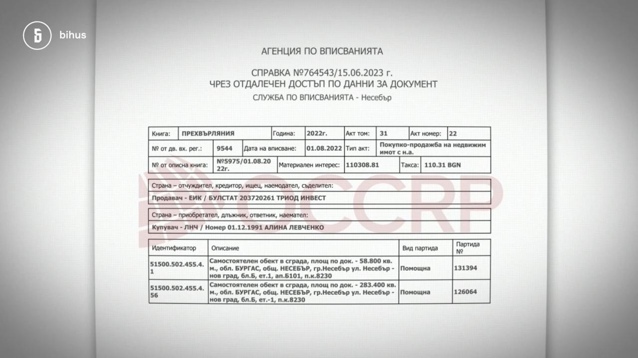 За даними болгарського майнового реєстру, 1 серпня 2022-го Аліна Левченко придбала квартиру площею 58.8 кв.м. та приміщення на першому поверсі площею 283.4 кв. м. у житловому комплексі Valencia Gardens у Несебрі.