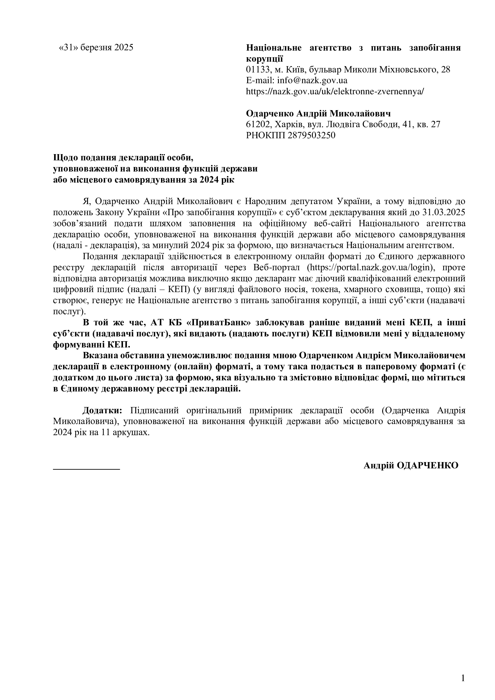 Я, Одарченко Андрій Миколайович є Народним депутатом України, а тому відповідно до положень Закону України «Про запобігання корупції» є суб’єктом декларування який до 31.03.2025 зобов’язаний подати шляхом заповнення на офіційному веб-сайті Національного агентства декларацію особи, уповноваженої на виконання функцій держави або місцевого самоврядування (надалі - декларація), за минулий 2024 рік за формою, що визначається Національним агентством.