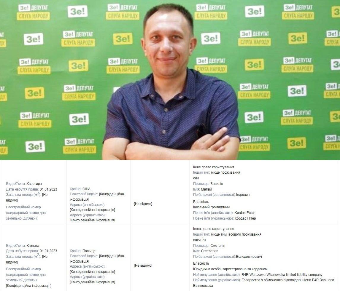Своєю чергою, Святослав Сметанін який є пасинком Василіва, також 1 січня 2023 року перебрався за кордон. Пасинок нардепа має зареєстроване місце проживання в кімнаті у столиці Польщі Варшаві. Житло належить польському ТОВ "Р4Р Варшава Віляновська".