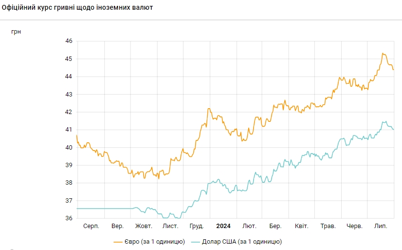 Офіційний курс на 31 липня 2024 року встановлено на такому рівні: 41,0291 грн за 1 долар (-0,0187 грн). Курс євро становитиме 44,4181 гривень за 1 євро (+0,0126 грн).