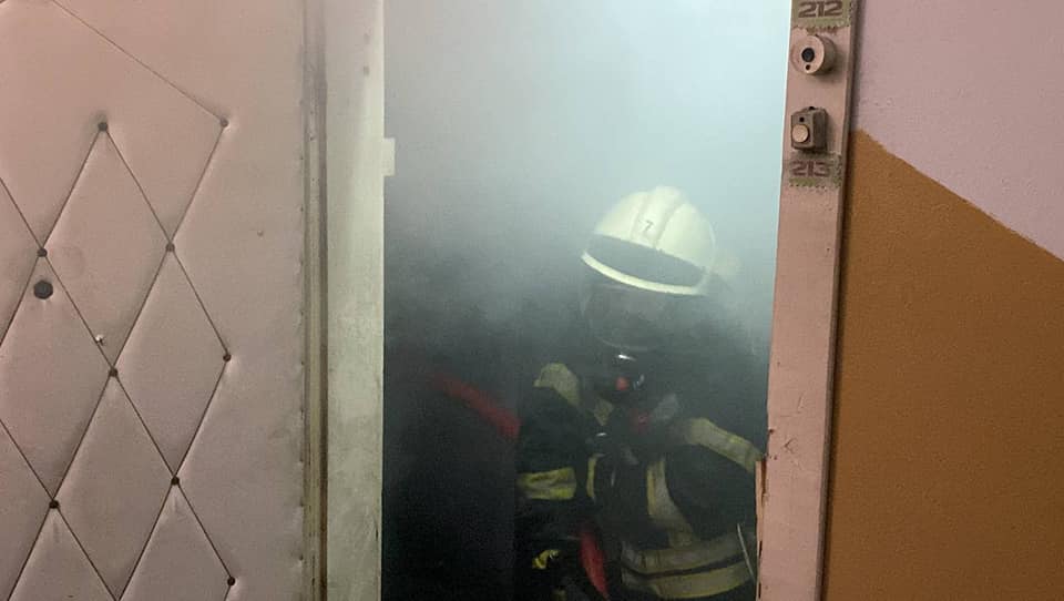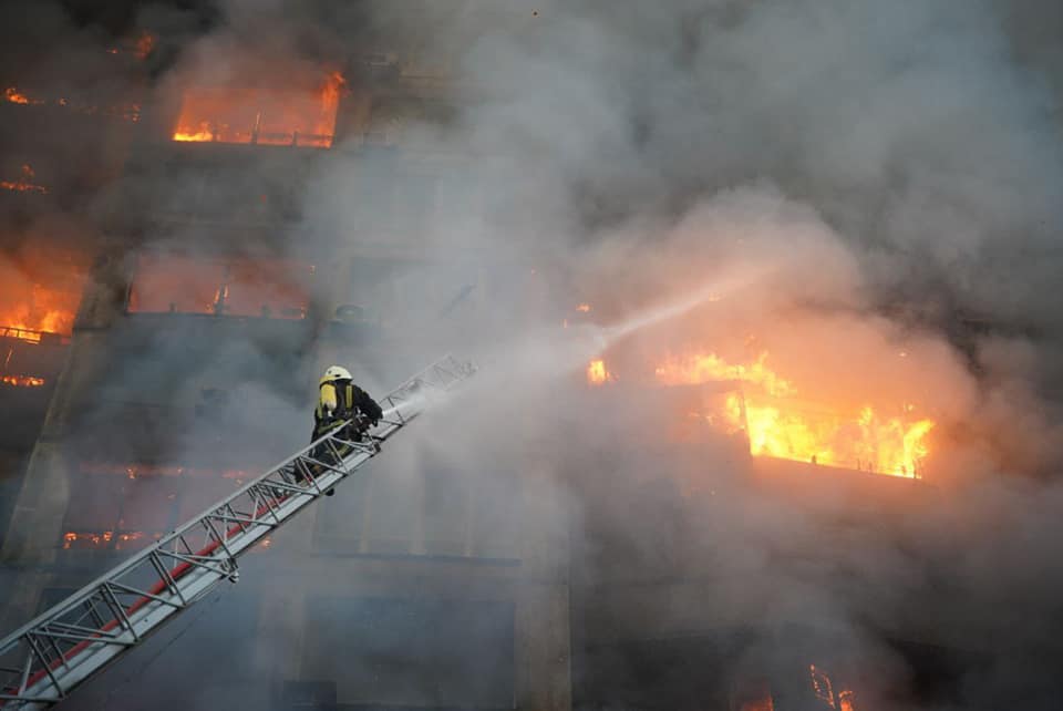 У Подільському районі Києва, внаслідок влучання боєприпасу в десятиповерховий житловий будинок, сталося загорання з 1 по 5 поверхи.