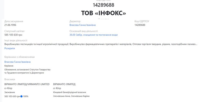 Своєю чергою, власником ТОВ «Інфокс» є кіпрська «Вірманто Лімітед». А власниками цього кіпрського офшору є Каріна та Анна Злочевські, яким нещодавно свою частку відступив Микола Злочевський. Хоча суті справи це аж ніяк не змінює.