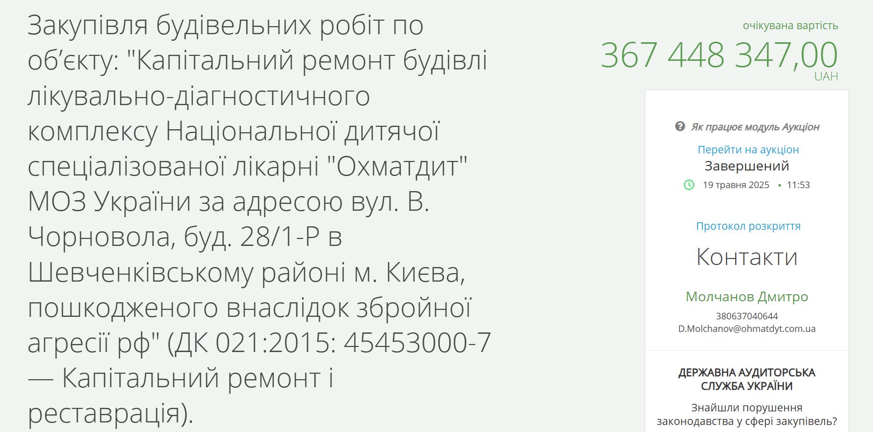 Національна дитяча спеціалізована лікарня "Охматдит" провела закупівлю на капітальний ремонт корпусу, що постраждав внаслідок ракетного обстрілу в липні 2024 року. Переможцем тендеру стало ТОВ "Ріола-Модуль ЛТД" з пропозицією у 293 млн грн. Очікувана вартість закупівлі складала 367,45 млн грн.