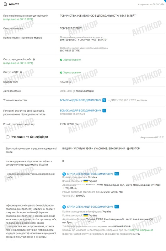 ТОВ «Вест Естейт» було створене у 2018 році. Бенефіціарним власником є Олександр Володимирович Крупа, а місцем реєстрації компанії заявлена його домашня адреса. Статутний капітал фірми становить 2,4 млн гривень.