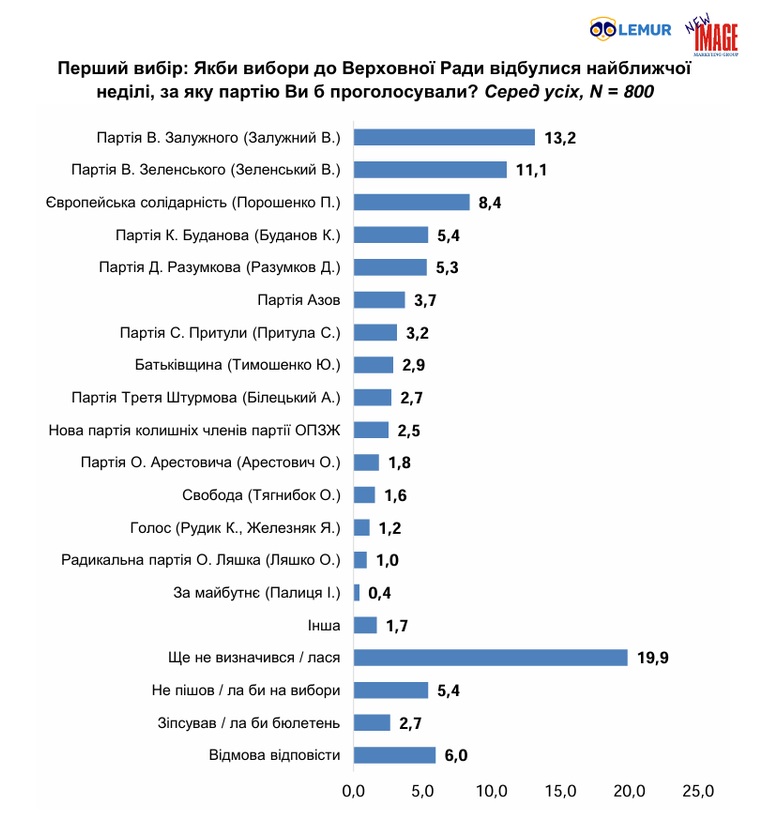Згідно з даними опитування, партію колишнього головнокомандувача Збройних Сил України, нині посла у Великій Британії Валерія Залужного, готові підтримати 13,2% респондентів.