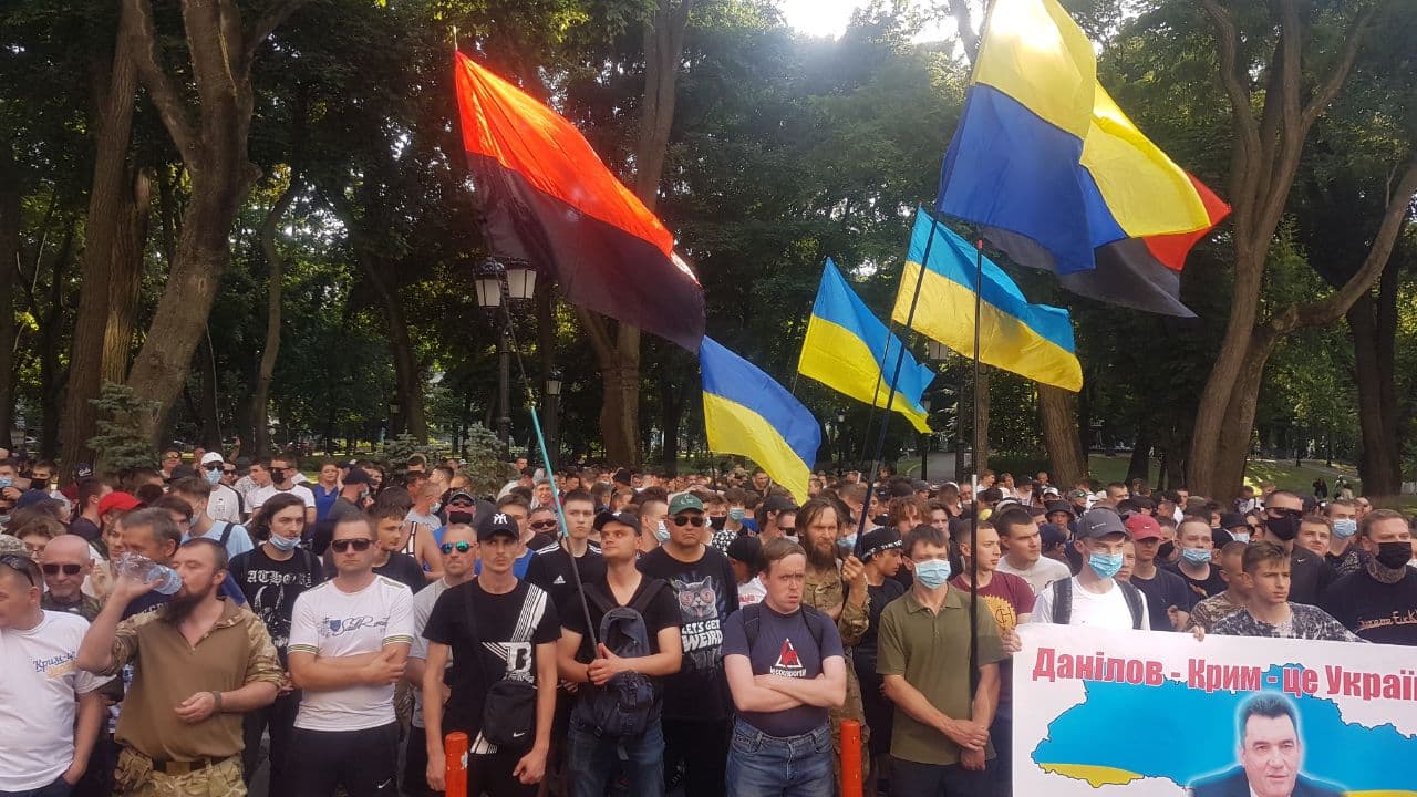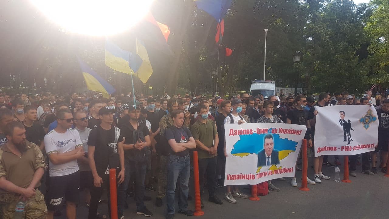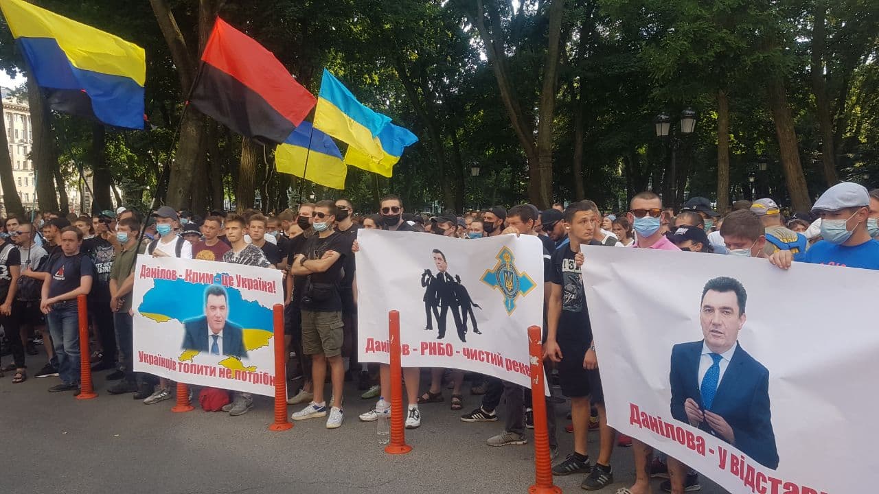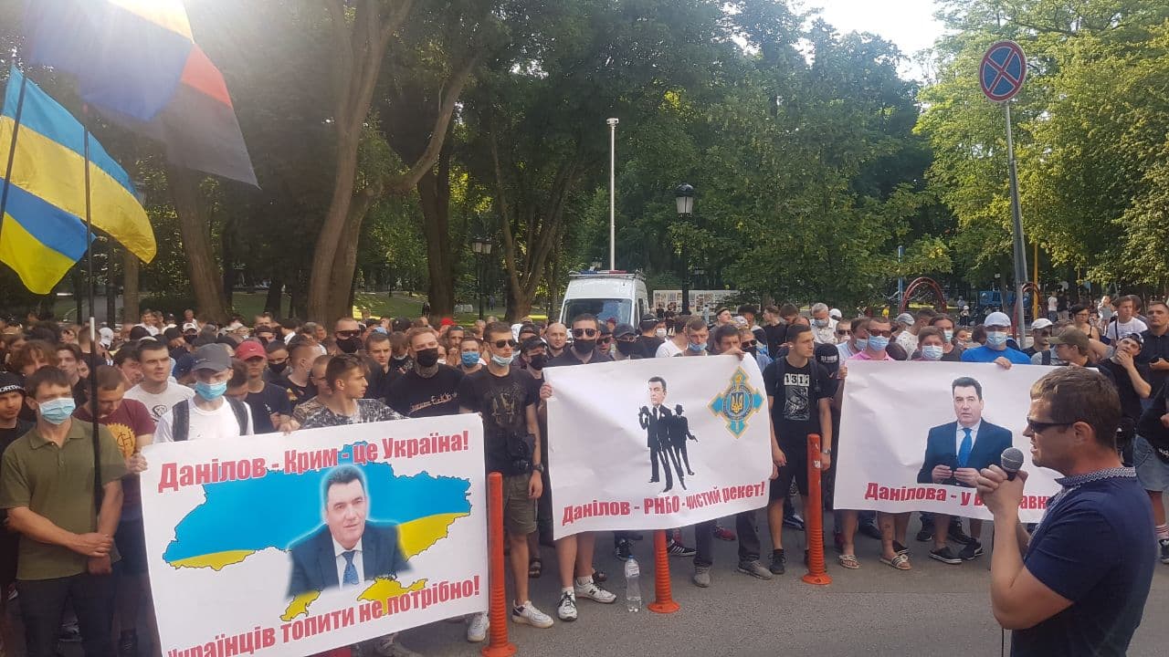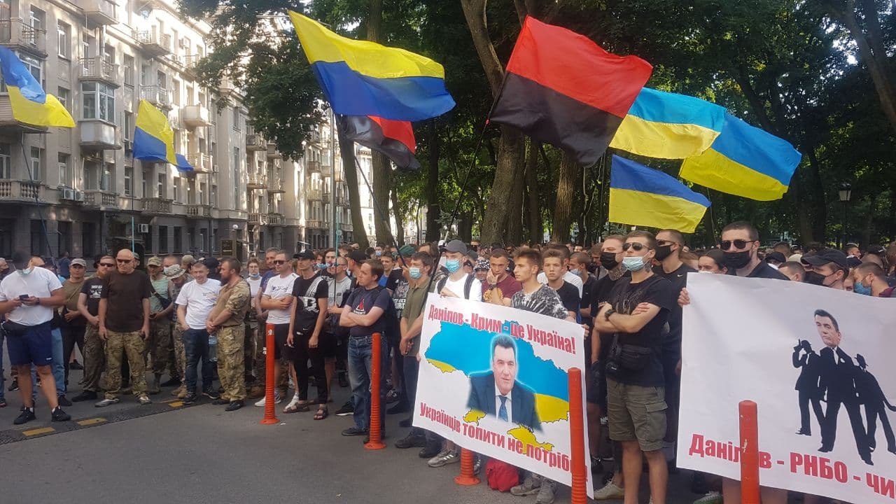 В руках активісти тримають синьо-жовті і червоно-чорні прапори і плакати з написами "Крим - це Україна, Україну топити не потрібно", "Данілов! РНБО – це рекетири" (учасники акції вважають, що РНБО перевищує свої повноваження - ред.) тощо.