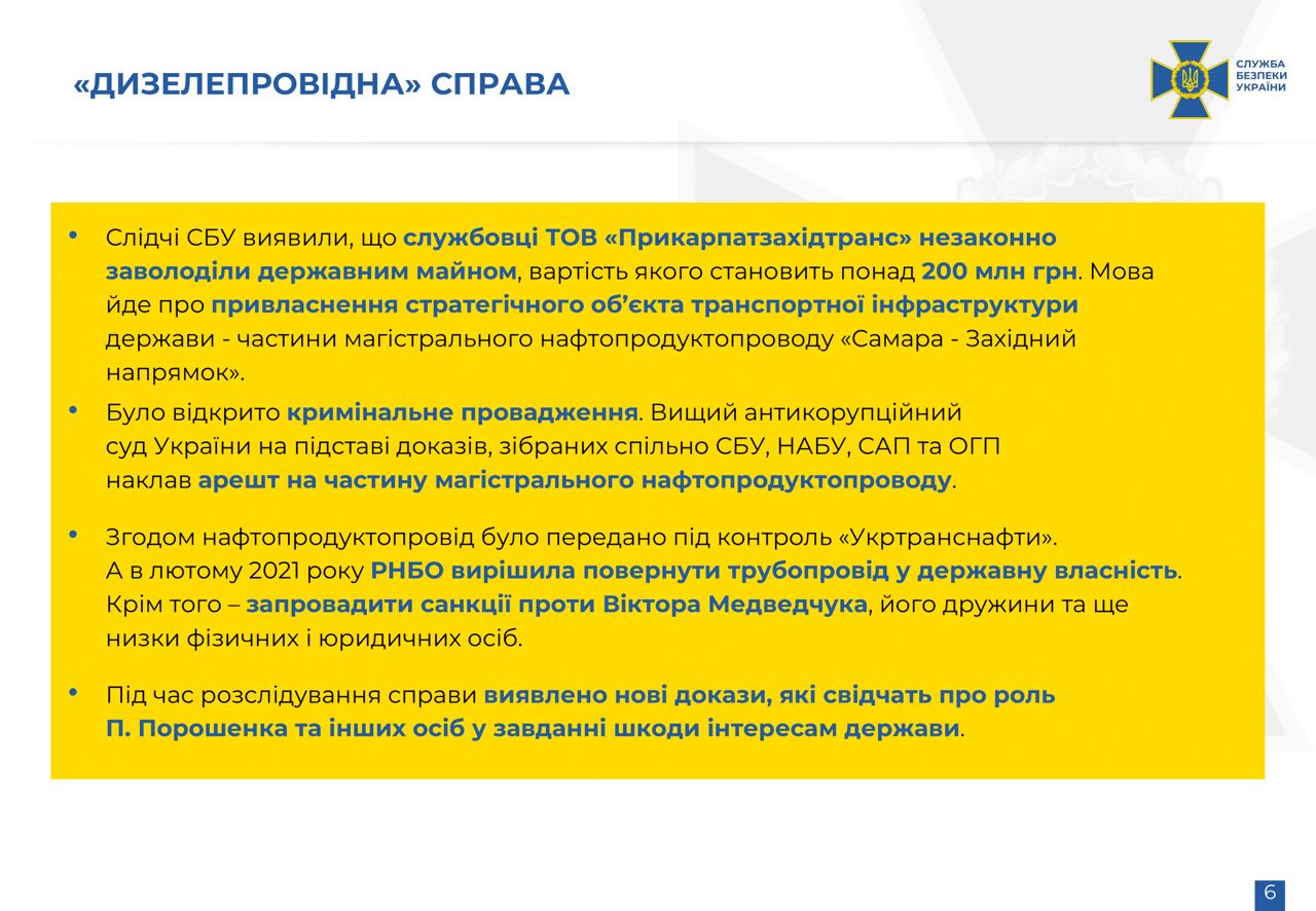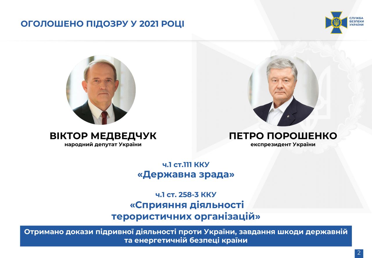 Нагадаємо, затриманий СБУ Медведчук розповів про схеми виведення з державної власності частини магістрального нафтопродуктопроводу для прокачування через нього дизельного палива і закупівлі вугілля на тимчасово окупованих територіях Донбасу. Описуючи суть схем, Медведчук повідомив, що Порошенко не лише звернувся до нього з проханням сконтактувати з керівництвом рф, а й забезпечив прийняття необхідних рішень в усіх українських інстанціях.