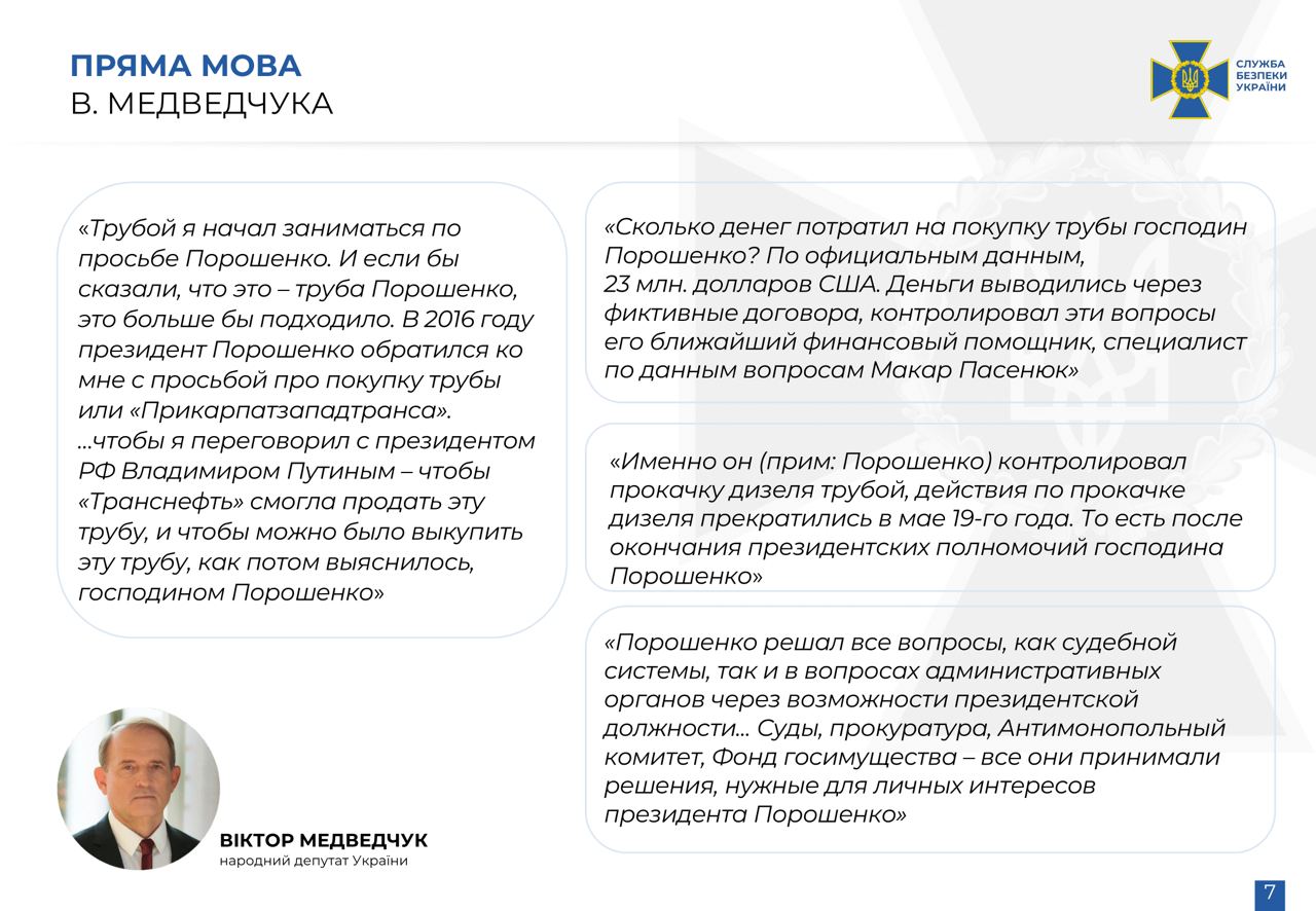 Він підтверджує, що експрезидент Порошенко використовував зв’язки Медведчука з керівництвом рф, щоб організувати певні бізнесові схеми. І вони, на думку СБУ, були точно не в інтересах України. Навпаки – економіка та безпека держави зазнали прямих збитків. І цьому сприяли різноманітні високопосадовці: виходячи зі свідчень пана Медведчука – від міністрів до голови Нацбанку, – сказав очільник відомства.