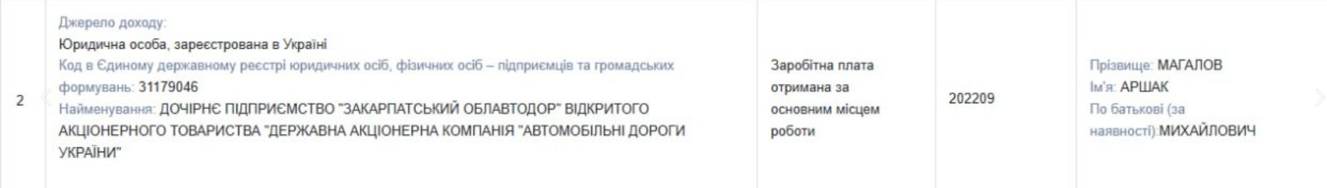 Сукупний дохід посадовця за 2024 рік від роботи в "Київзеленбуді" становив 282 232 гривні, ще 202 209 гривень вказано як дохід від підприємства "Закарпатський облавтодор". У коментарі журналістам Магалов заявив, що не працює в цій установі понад два з половиною роки та не отримував від неї грошей, хоча в реєстрах він фігурує як уповноважена особа.