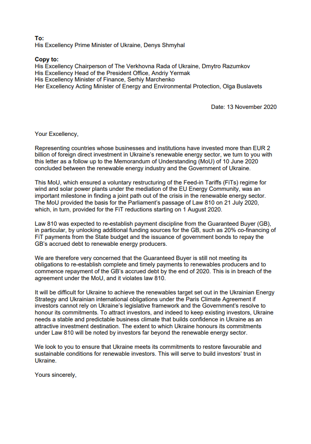 Цей лист-звернення є продовженням Меморандуму про взаєморозуміння від 10 червня 2020 року, укладений між галуззю відновлювальної енергетики та урядом України.
