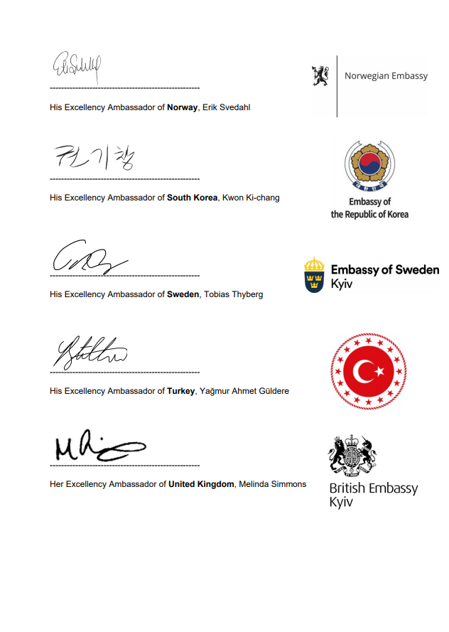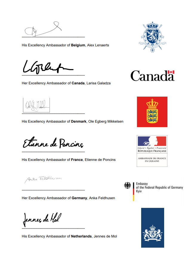 Звернення підписали представники Бельгії, Данії, Канади, Франції, Німеччини, Нідерландів, Норвегії, Південної Кореї, Швеції, Туреччини та Великої Британії.