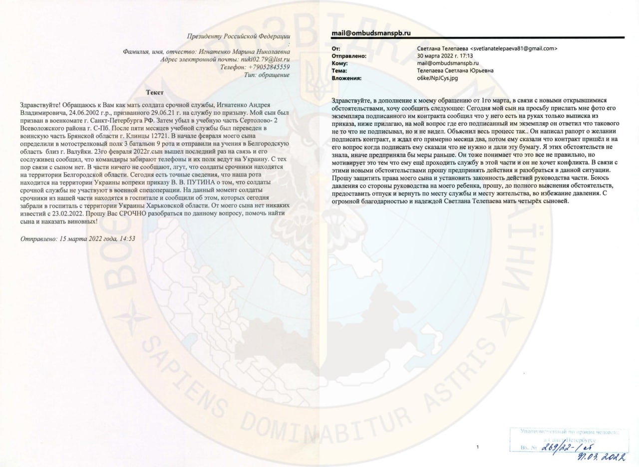Матері російських строковиків, розуміючи невідворотність смерті їхніх дітей, звертаються зі скаргами на незаконні дії командирів до уповноваженої з прав людини у рф Тетяни Москалькової, але у відповідь отримують чергову брехню та відписки.