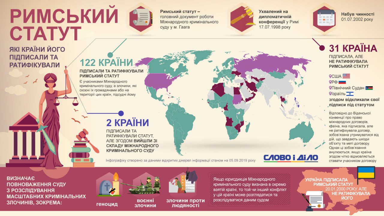 Нагадаємо, що Україна підписала Римський статут 20 січня 2000 року, але не ратифікувала його, хоча після підписання Угоди про асоціацію з ЄС у 2014 році ратифікація цього документу була одним із прямих міжнародних зобов'язань України.