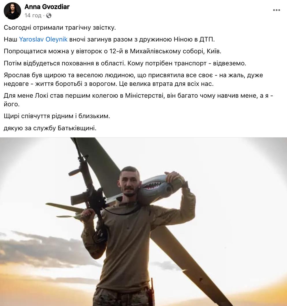 У ДТП на Житомирщині загинув радник міністра з питань стратегічних галузей промисловості Ярослав Олійник, відомий під позивним "Локі". Разом з ним загинула його дружина.