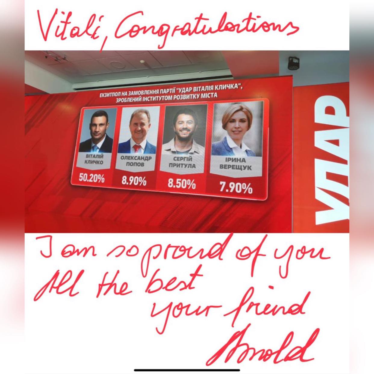 За результатами екзит-полу соціологічної групи "Рейтинг", за Віталія Кличка (досьє) проголосували 47,8% виборців.