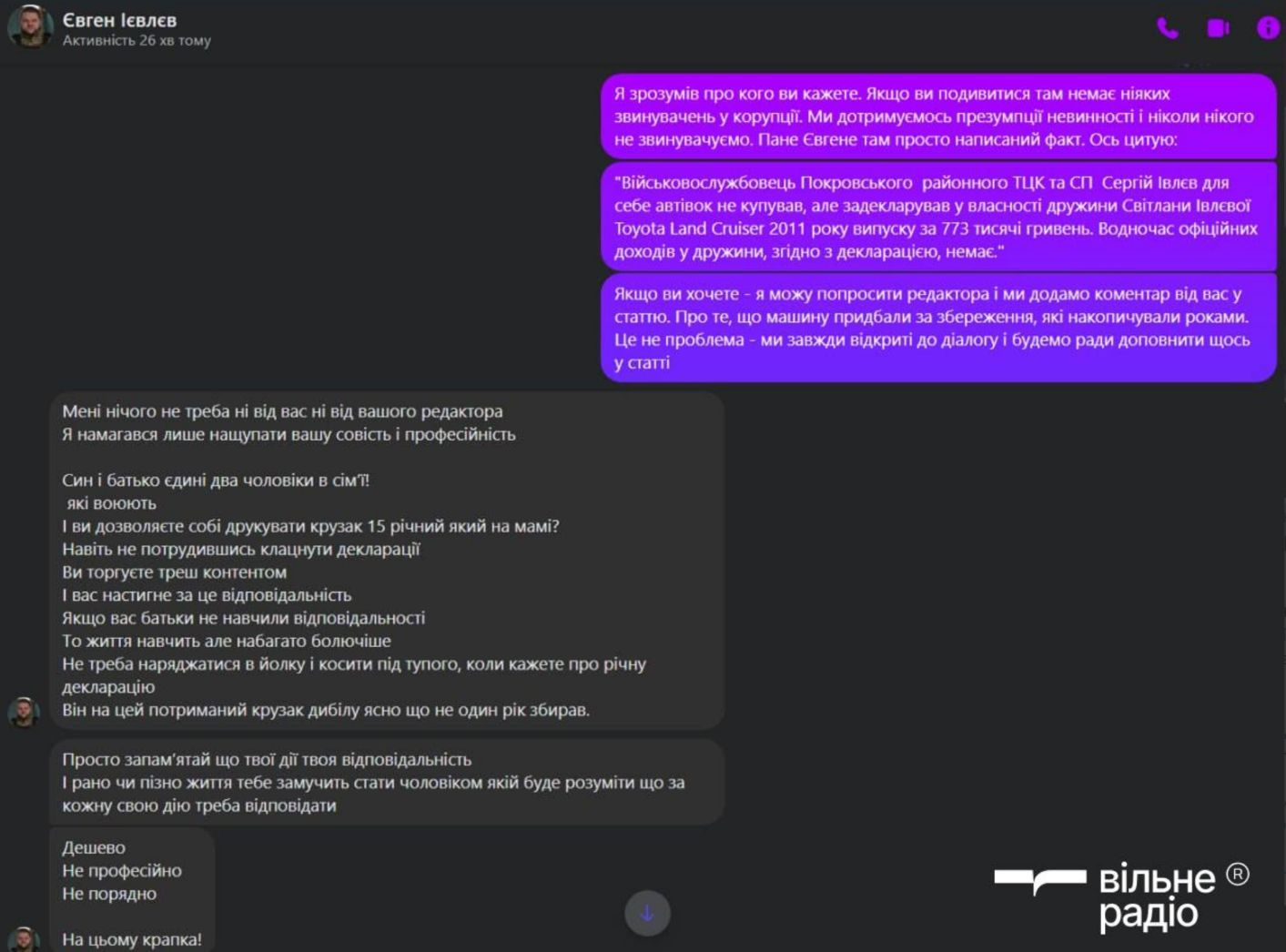 Журналіст Вільного Радіо Євген Вакуленко повідомив про отримання погроз від речника Київської міської військової адміністрації Євгена Ієвлєва. Погрози надійшли після публікації матеріалу, в якому згадувалося задеклароване майно батька Ієвлєва — працівника Покровського районного територіального центру комплектування Сергія Ієвлєва.