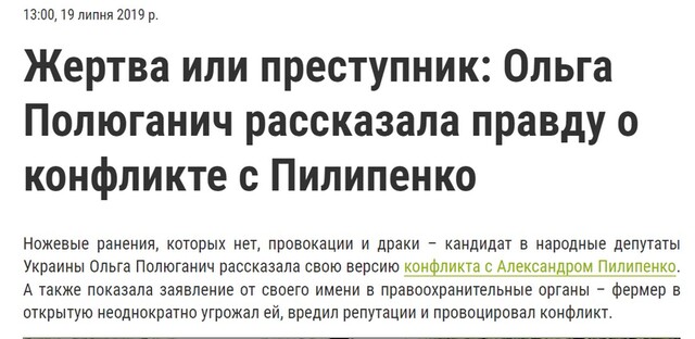 Таку новину просто не могли не підхопити жадібні до сенсацій журналісти, ба більше, що Пилипенко опинився в лікарні з ножовими пораненнями. Він висунув версію, що чоловік кандидатки напав на нього за допомогою охорони, побив, завдав вісім ножових поранень і забрав із джипа 30 тисяч доларів і 213 тисяч гривень. Причина конфлікту – нібито захоплення земель, що належать Олександру Пилипенку, якого автори репортажів назвали фермером, яке здійснив у 2017 році Віктор Полюганич. Загалом, кому цікаво, посилання ось.