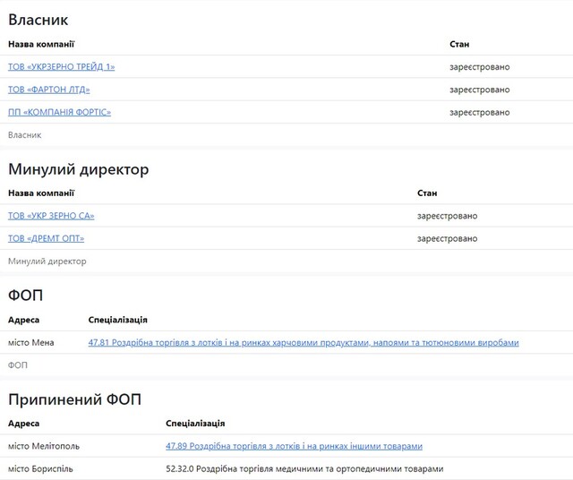 Нескладна перевірка в реєстрах говорить нам, що Олександр Пилипенко є прямим власником трьох фірм, що згадуються у зв’язку з податковими скрутками – ТОВ «Укрзерно трейд 1» (Березівка Одеської області), ТОВ «Фартон Лтд» (Бровари) та ПП «Компанія Фортіс» ( Богодухів, Харківська область). Також він має зареєстрований ФОП у місті Мена та два ліквідовані – у Мелітополі та Борисполі. Ще Олександр Пилипенко очолював ТОВ «Дрем опт» (Запоріжжя) та ТОВ «Укр Зерно СА» (Бершадь).