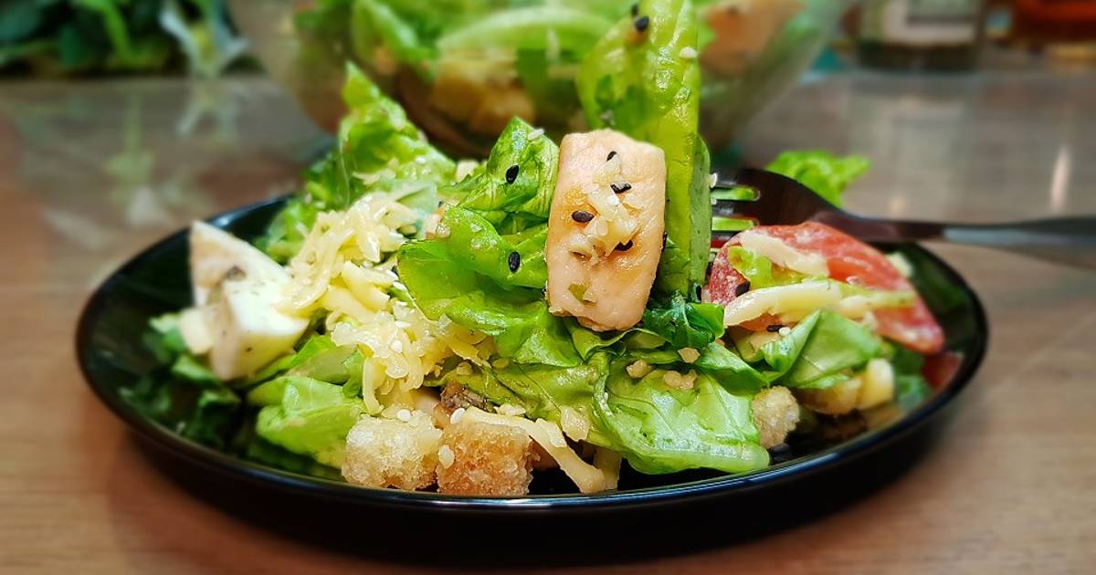 - Заправте салат спеціями та оливковою олією, добре перемішайте.