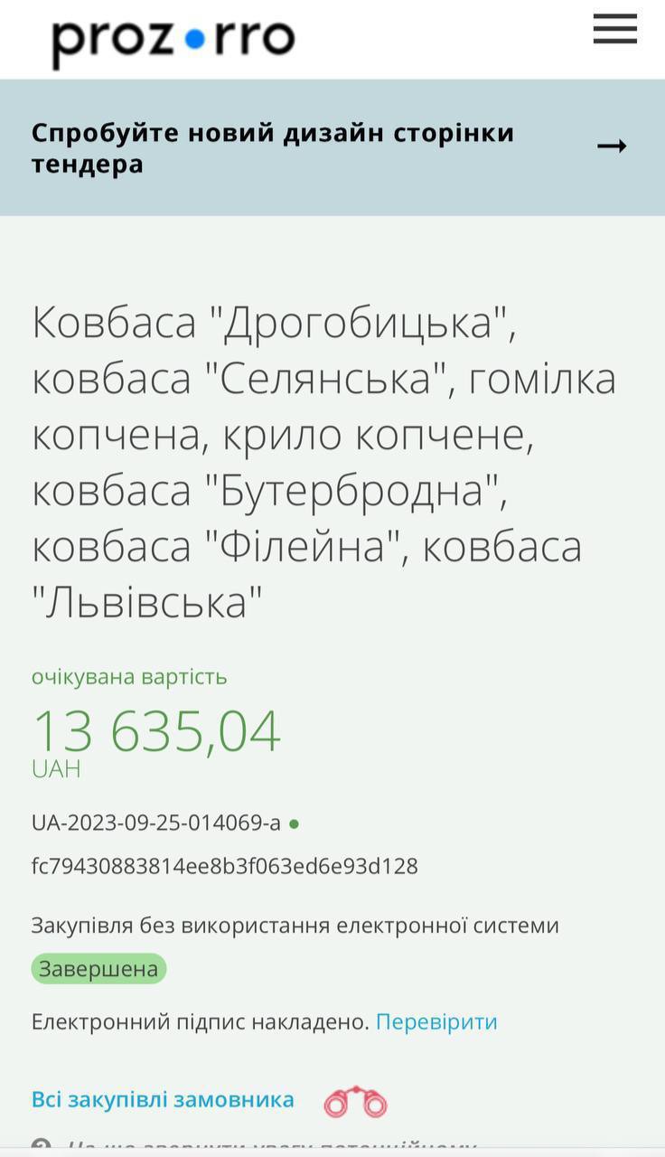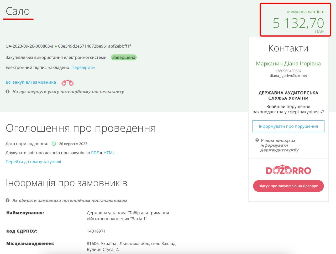 Держпідприємство "Табір для утримання військовополонених Захід 1" закупило 19 кг сала вартістю 5132 грн. Тобто вартість за 1 кг — 270 грн (у супермаркеті, наприклад, можна купити кіло за 229 грн).