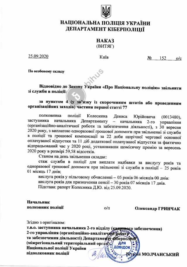 Журналісти отримали пакет документів, що свідчать про офіційне звільнення Колесника з посади заступника начальника 30 вересня 2020 року.