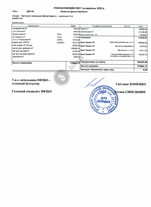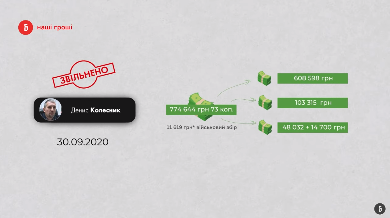 Зазначається, що перед тим чоловік задекларував понад 750 тисяч гривень виплат, пов’язаних з цим звільненням. З них – 608 тисяч разова допомога при звільненні, 103 тисячі – зарплата, премії й невикористані відпустки, ще понад 60 тисяч – матеріальна допомога і допомога на розв'язання соціально-побутових питань.