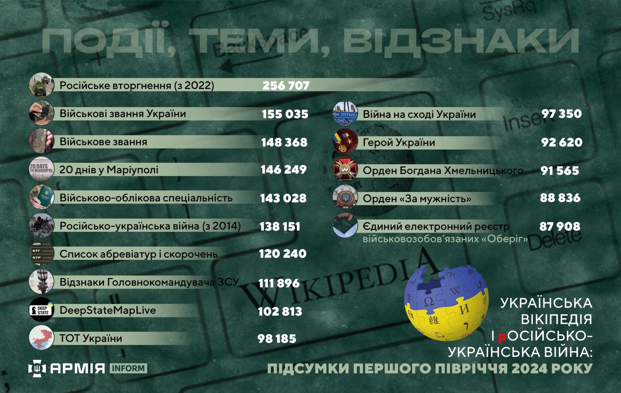 Попри те, що у 2022 і 2023 роках стаття «Російське вторгнення в Україну (з 2022 р.)» була на першому місці, у першому півріччі 2024 року вона опустилася на кілька позицій з 256 707 переглядами. Цьогоріч її обійшла стаття «Територіальний центр комплектування та соціальної підтримки» з 281 654 переглядами.
