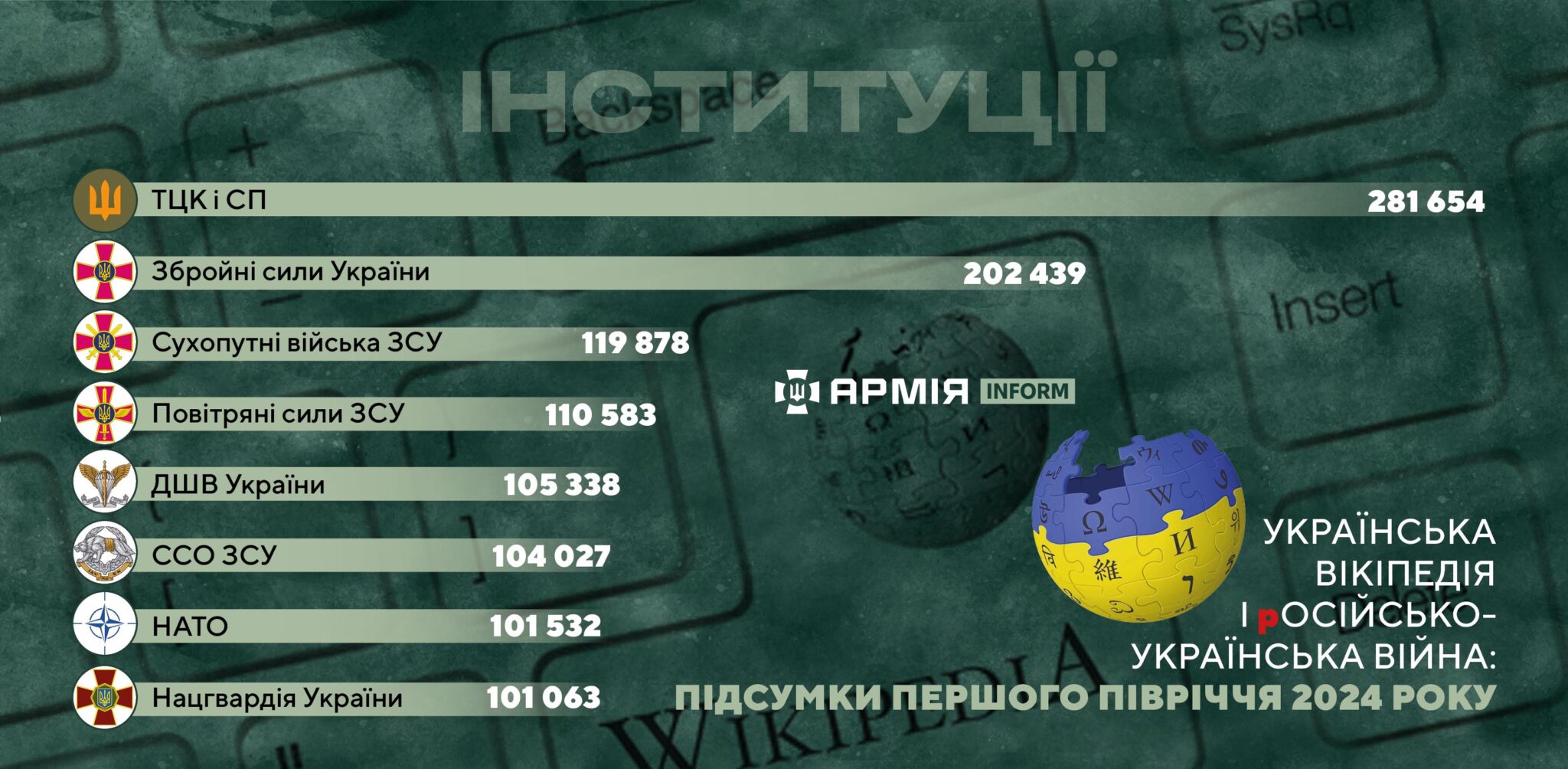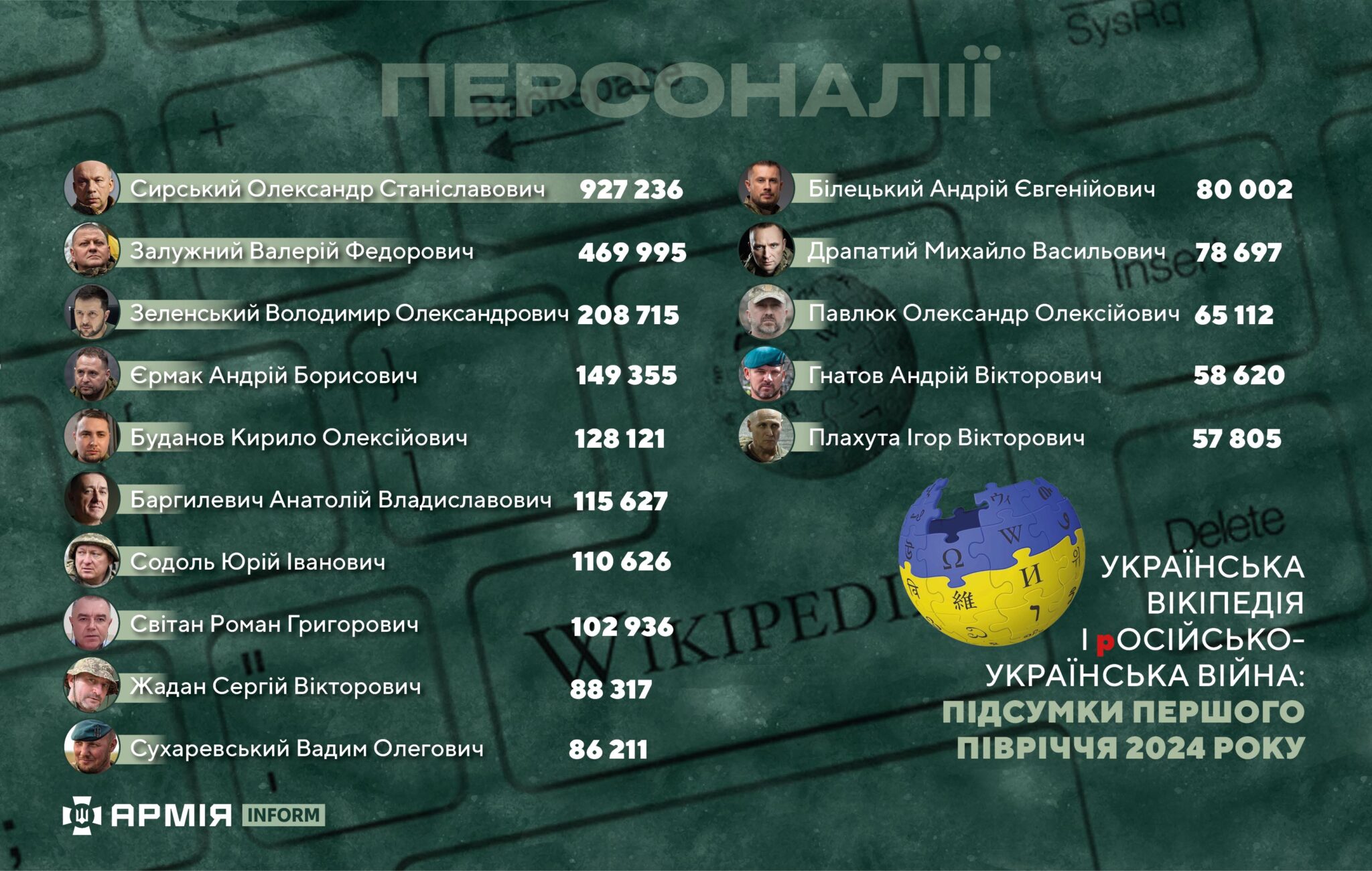 У першому півріччі 2024 року найпопулярнішими статтями української Вікіпедії на військову тематику стали матеріали про Головнокомандувача ЗСУ Олександра Сирського та його попередника Валерія Залужного.
