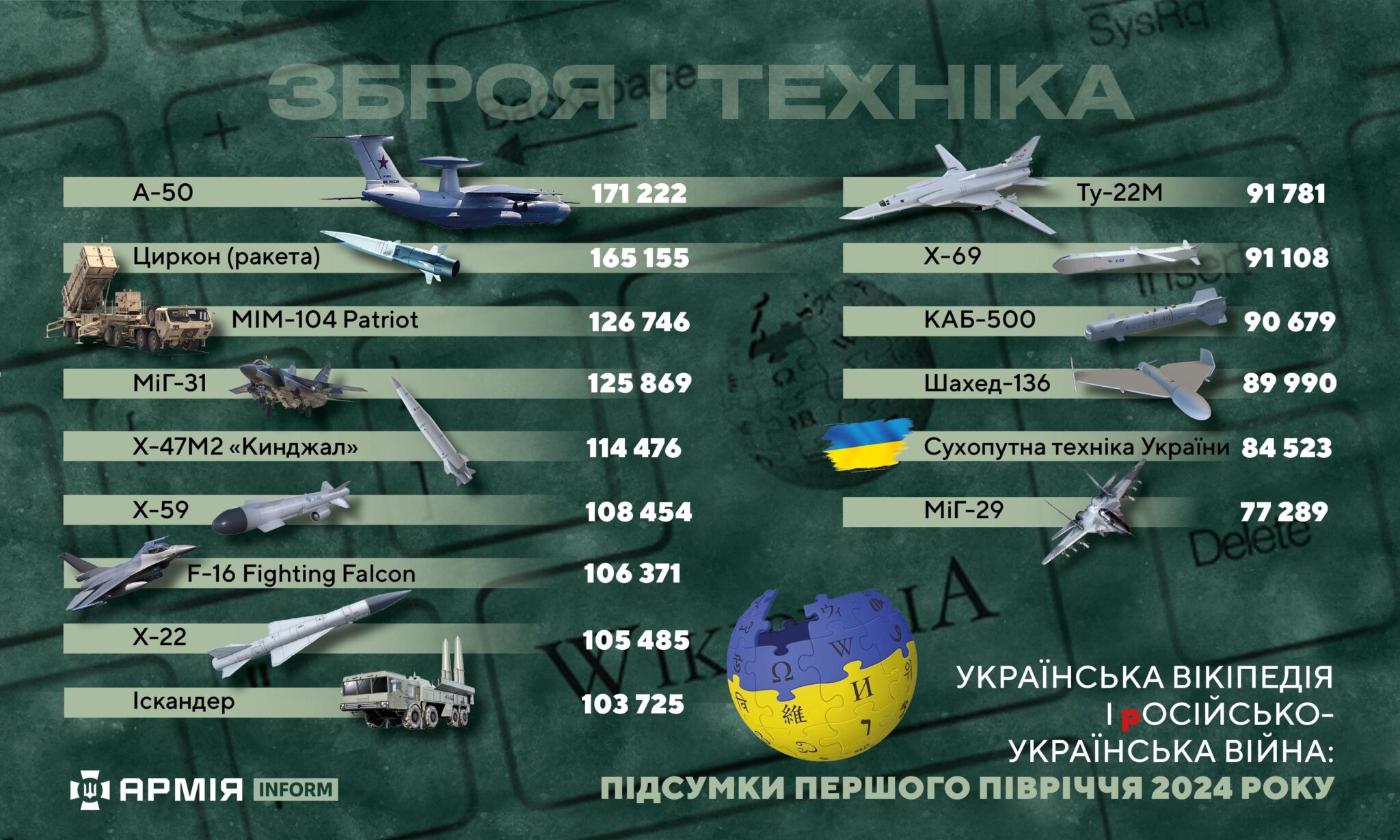 Зброя і техніка: А-50 (171 222), «Циркон» (ракета) (165 155), MIM-104 Patriot (126 746).