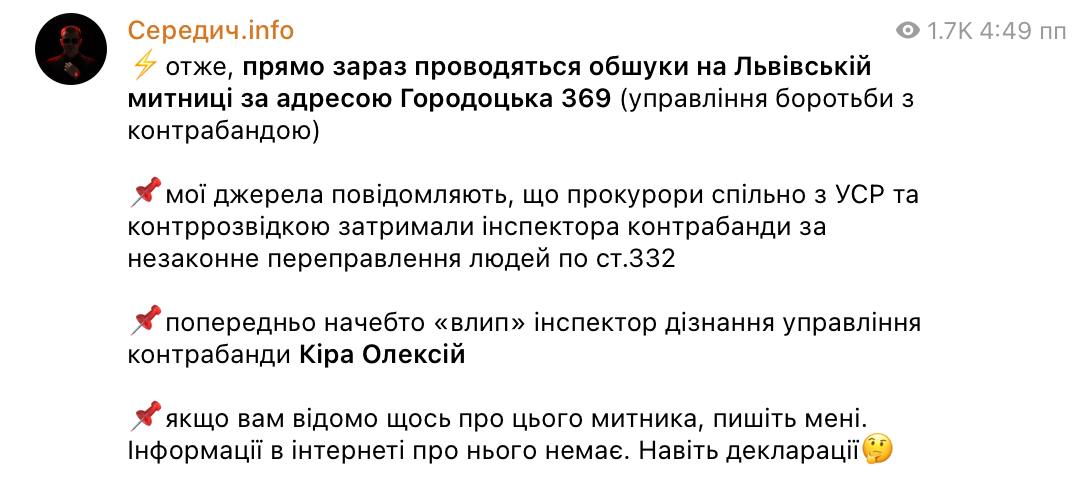 "Мої джерела повідомляють, що прокурори спільно з УСР та контррозвідкою затримали інспектора контрабанди за незаконне переправлення людей по ст.332. Попередньо начебто «влип» інспектор дізнання управління контрабанди Кіра Олексій", - зазначив Середич.