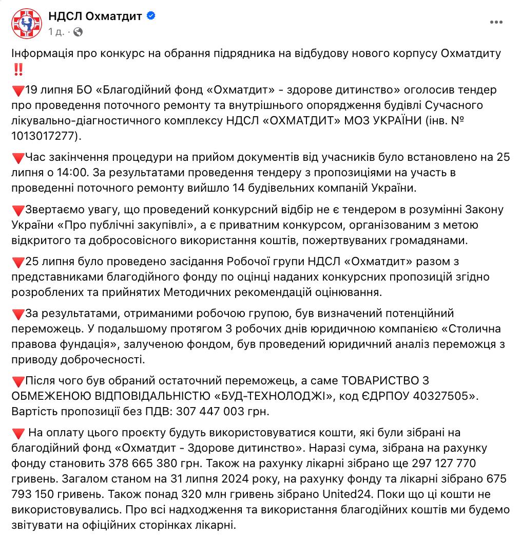 Через резонанс навколо вибору підрядника, МОЗ звернулося до правоохоронних органів для додаткових перевірок. Міністр наголосив на прозорості процесу і запросив усіх охочих на зустріч в "Охматдиті" для обговорення ситуації.