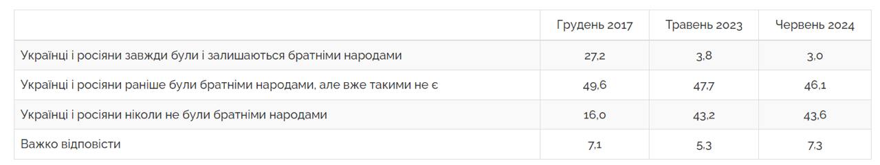 Лише 3% українців у 2024 році погоджуються з тезою, що українці та росіяни є братніми народами. Це значне зниження у порівнянні з 27% у 2017 році. Водночас, кількість тих, хто вважає, що українці і росіяни ніколи не були братніми народами, зросла з 16% до 44%.