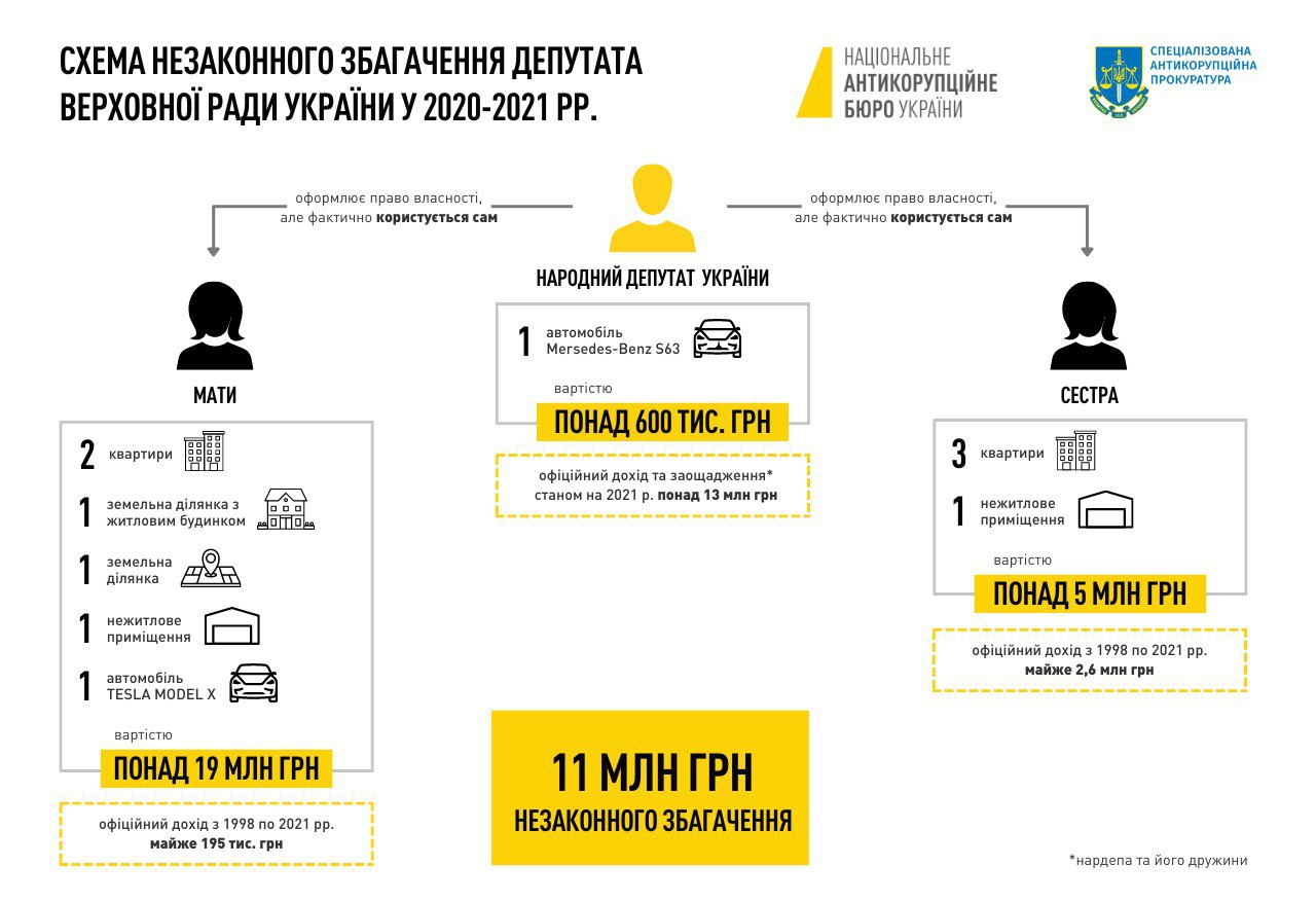 У межах досудового розслідування, яке здійснюють детективи НАБУ за матеріалами НАЗК, встановлено, що у 2020-2021 роках народний депутат набув у власність активи загальною вартістю 25 млн грн – 5 квартир у м. Києві, 3 земельні ділянки на Київщині, 2 нежитлові приміщення, а також автомобілі Tesla та Mersedes-Benz. Переважну частину набутого майна депутат оформив на близьких родичів, зберігши за собою право розпоряджатися ним у повному обсязі.