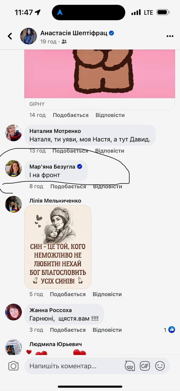 "На ранок сьогоднішнього дня шкандаль з Безуглою заграв новими фарбами… Її колега і моя землячка нардеп від "Слуг Народа" по 148 в/о Анастасія Ляшенко яка нещодавно вийшовши заміж взяла прізвище чоловіка - Шефтіфрац, так хотіла похвалитися своїм щастям опублікувала в Фейсбуці фото свого 7-ми місячного сина Давида. В коментарі прибігла Мар’яна Безугла залишивши коментар: «і на фронт». Ляшенко-Шефтіфрац наскаржилася в фракційний чат і шкандаль розгорівся по новому…", - розповів Мосійчук.