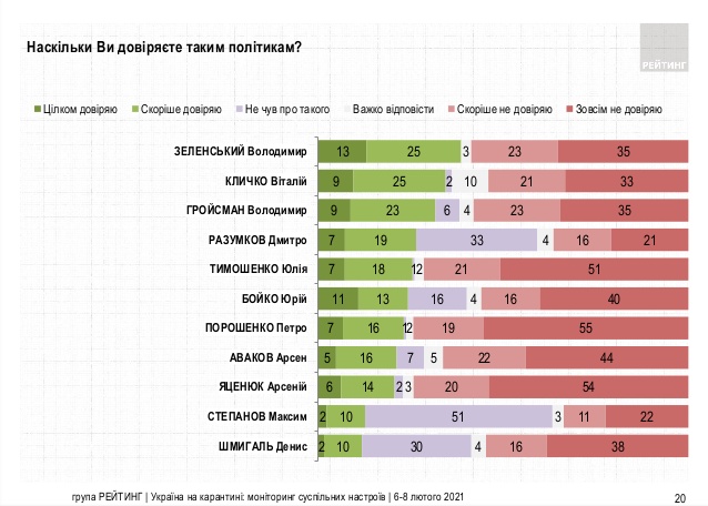 Читайте такожЮлії Тимошенко довіряють 25%, не довіряють – 72%. Юрію Бойку довіряють 24%, не довіряють – 56%. Петру Порошенку довіряють 23%, не довіряють – 74%. Арсену Авакову довіряють 21%, не довіряють – 66%. Арсенію Яценюку довіряють 20%, не довіряють – 74%. Максиму Степанову довіряють 12%, не довіряють – 33% (не знають такого – 51%). Денису Шмигалю довіряють 12%, не довіряють – 54%, третина не чули про такого, - йдеться у результатах дослідження.