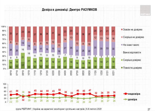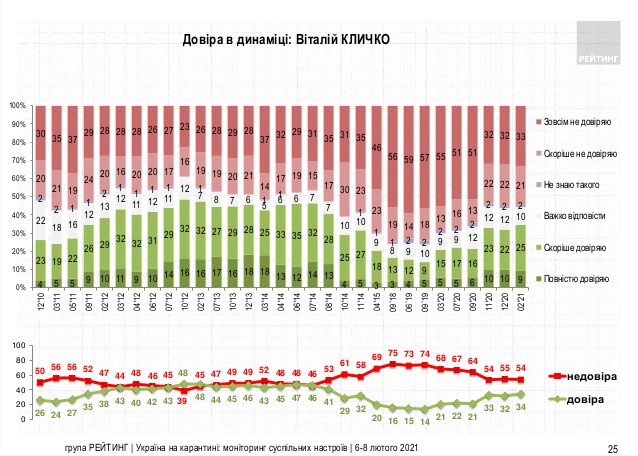 За даними соціологів на другому місці "довіри українців" знаходиться Віталій Кличко, якому довіряють 34%, не довіряють – 54%. За ним слідують Володимир Гройсман (32% та 58% відповідно) та Дмитро Разумков (26% і не довіряють – 37%).