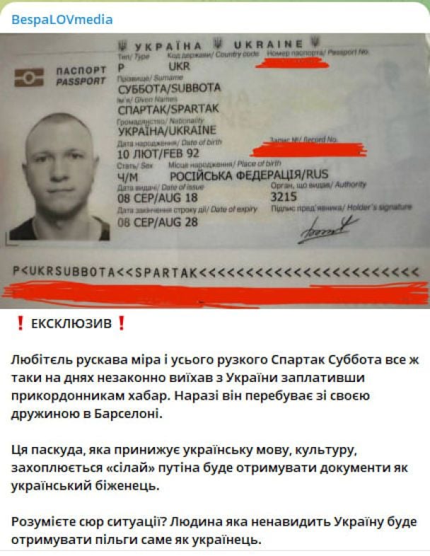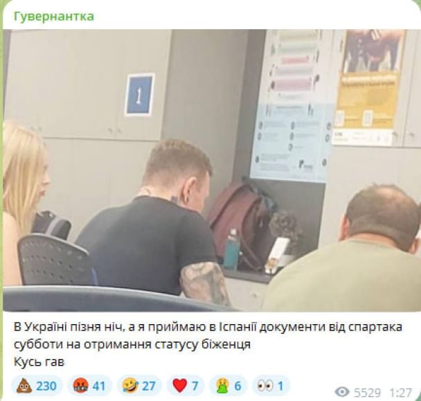 У Telegram-каналі "Гувернантка" зазначили, що Спартак Суббота хоче отримати статус українського біженця в Іспанії. Там показали фото, нібито Спартак з дружиною подавав необхідні документи.
