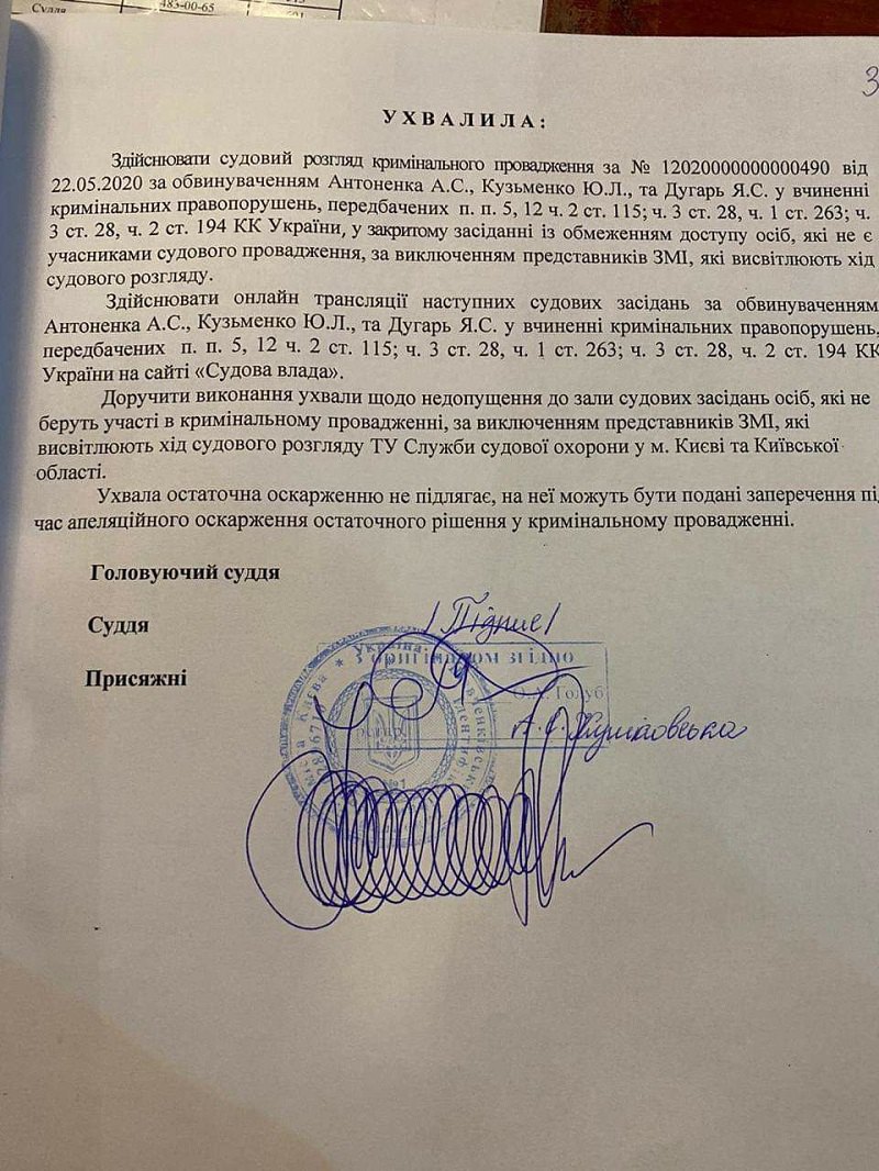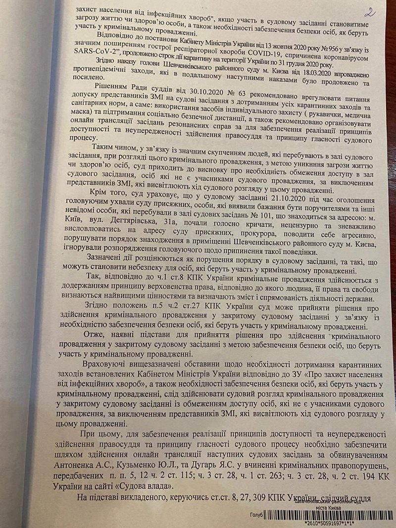 Суддя Голуб відмовилась заслуховувати захист та обвинувачених через закритий режим розгляду справи.