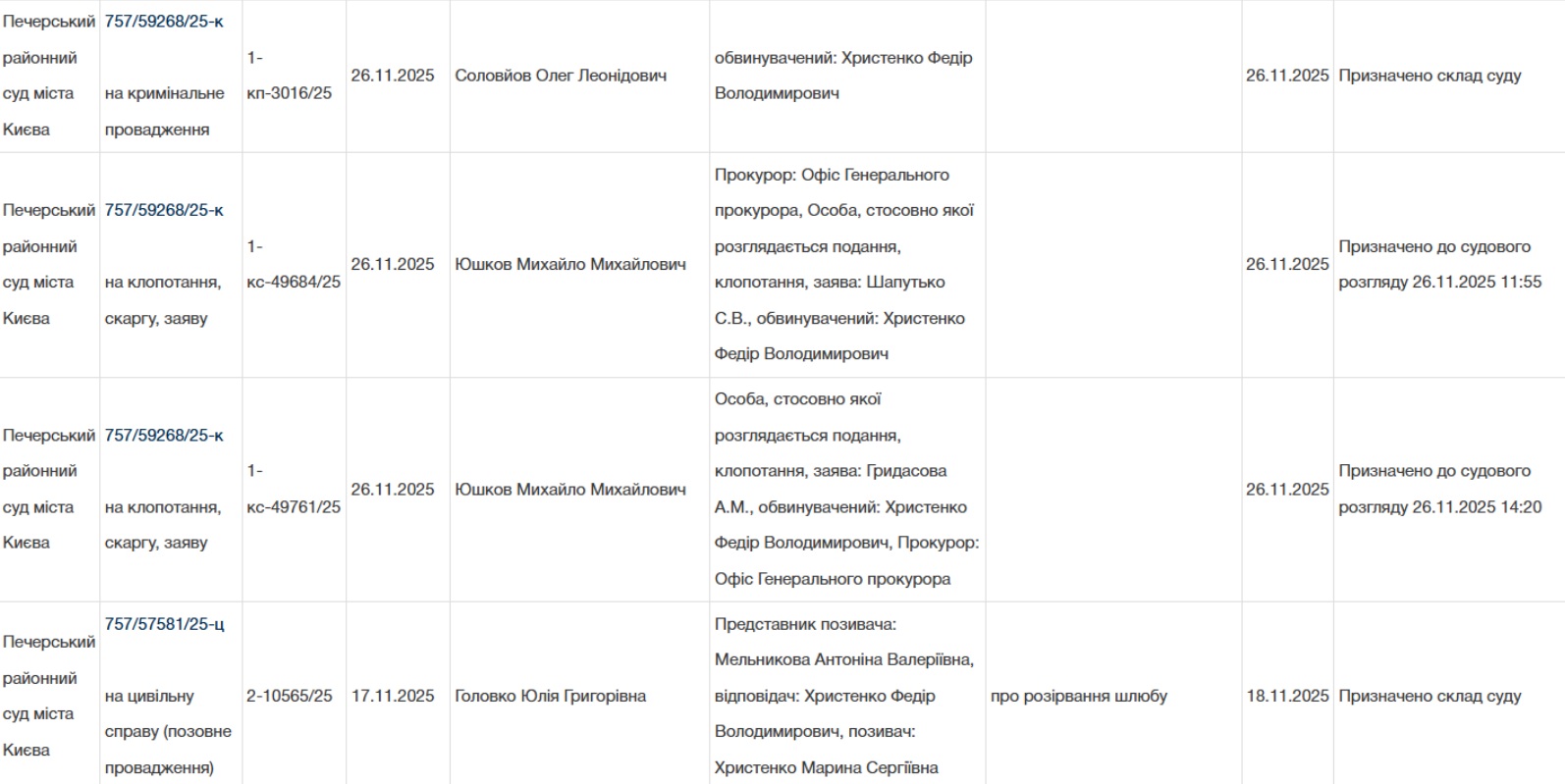 З порталу «Судова влада» також стало відомо, що 17 листопада дружина Христенка — Юлія Головко подала на розлучення. Якщо рахунки й майно нардепа арештовані, поділ майна в межах розлучення може дозволити їй уникнути подальшої конфіскації частини активів.