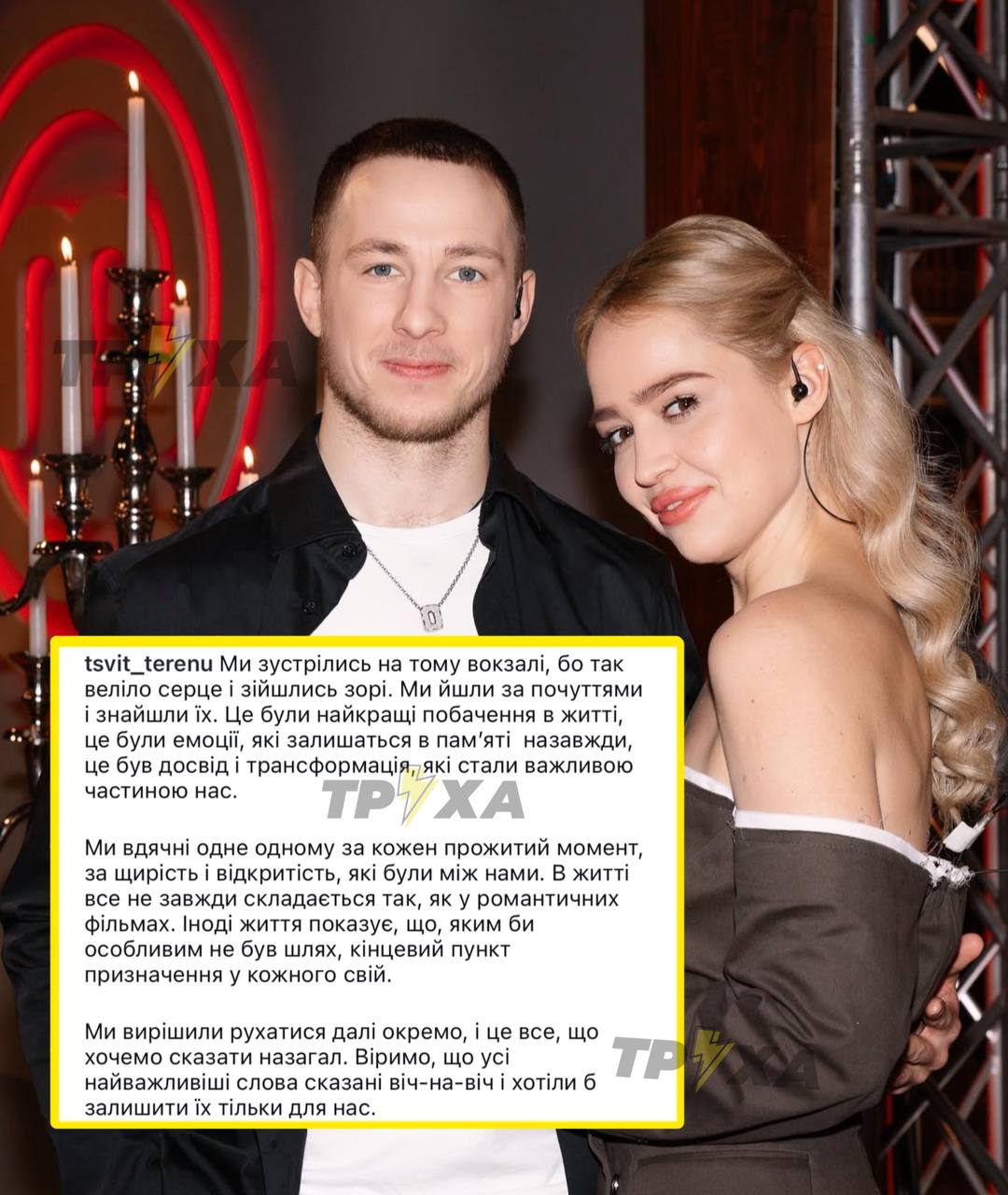 «У житті все не завжди складається так, як у романтичних фільмах. Іноді життя показує, що, яким би особливим не був шлях, кінцевий пункт призначення у кожного свій. Ми вирішили рухатися далі окремо, і це все, що хочемо сказати назагал», – повідомила пара.