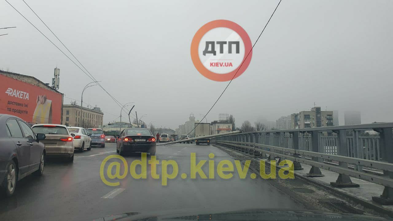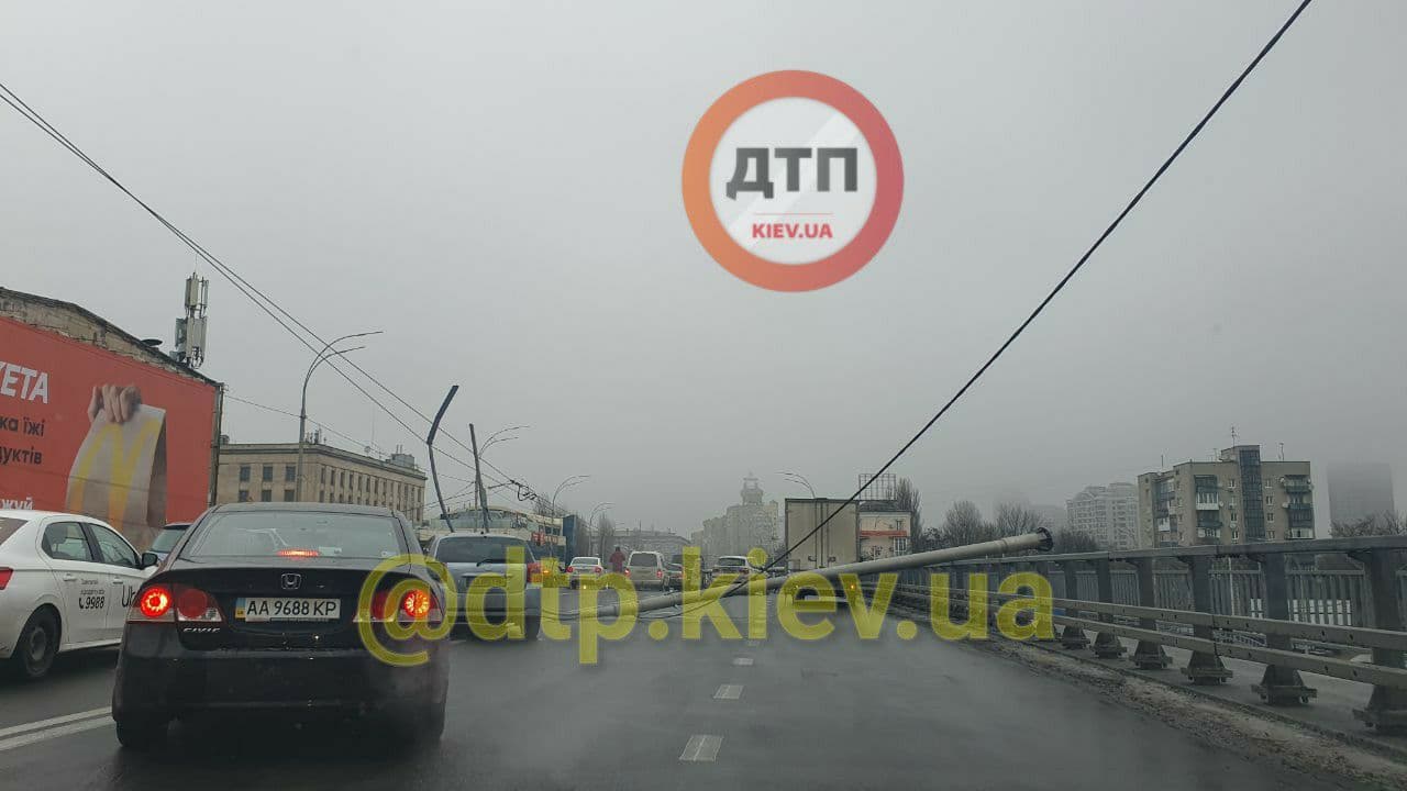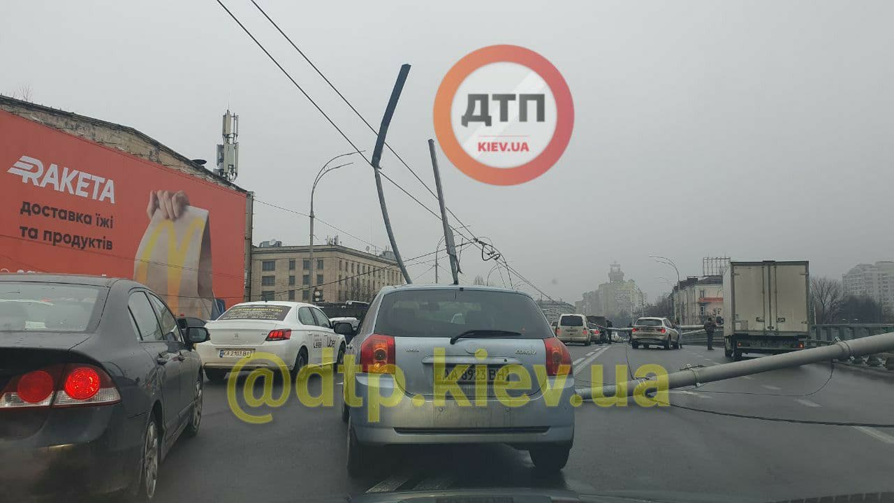 У Києві на Шулявському шляхопроводі впали троє нових стовпів освітлення. Вони звалилися прямо на автомобілі, які проїжджали дорогою.