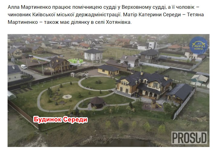 Інша представниця Печерського суду — Катерина Середа — володіє маєтком площею 299 кв. м у котеджному містечку «Міжріччя», розташованому в селі Хотянівка неподалік Києва. Земельні ділянки, на яких розташоване житло, оформлені на саму суддю, її матір Тетяну Мартиненко та сестру Аллу Мартиненко. Остання працює у Верховному Суді.